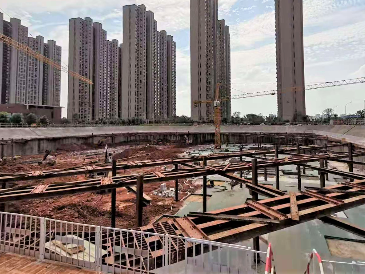 該項目位于武漢市洪山區青菱新區,地下設兩層地下室,基坑開挖面積14600㎡,基坑周長476m,基坑開挖深度9.8m—13.6m。在項目方案設計階段,設計中心技術團隊經充分討論后決定大膽創新,采用型鋼組合支撐的綠色新工藝,該工藝是武漢市兩層地下室基坑工程中的首次成功應用。