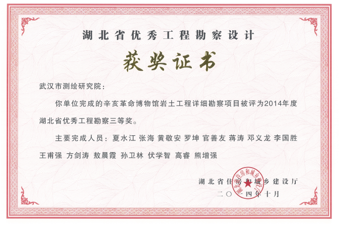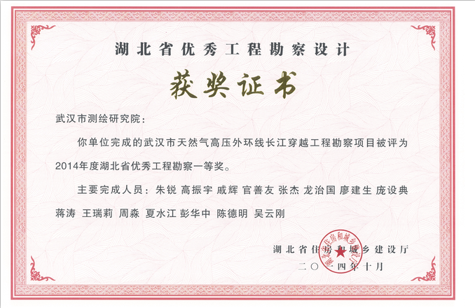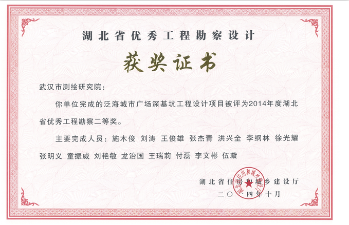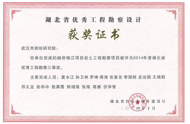 熱烈祝賀我公司在2014年度湖北省優(yōu)秀工程勘察設(shè)計(jì)獎評選中,榮獲省優(yōu)秀工程勘察設(shè)計(jì)獎項(xiàng)五項(xiàng)。