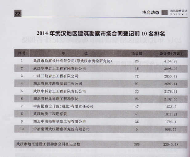 根據武漢市勘察設計協會出版的《武漢勘察設計》雜志2015年第一期刊登的最新統計,武漢市勘察設計有限公司2014年全年的勘察合同登記總金額達到4154.22萬元,再次名列武漢地區第一名。我公司在2012、2013、2014年已連續三年位居武漢地區建筑勘察市場合同登記前10名排名的榜首。 (綜合部)